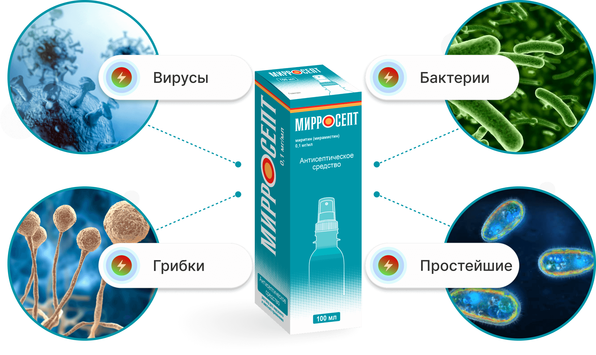 Хирургия, травматология, комбустиология: с профилактической и лечебной целью раствором Мирросепта 0,1 мг/мл орошают поверхность ран и ожогов, рыхло тампонируют раны и свищевые ходы, фиксируют марлевые тампоны, смоченные антисептиком. Лечебная процедура повторяется 2-3 раза в сутки в течение 3-5 дней. Высокоэффективен метод активного дренирования ран и полостей с суточным расходом около 1 л препарата.